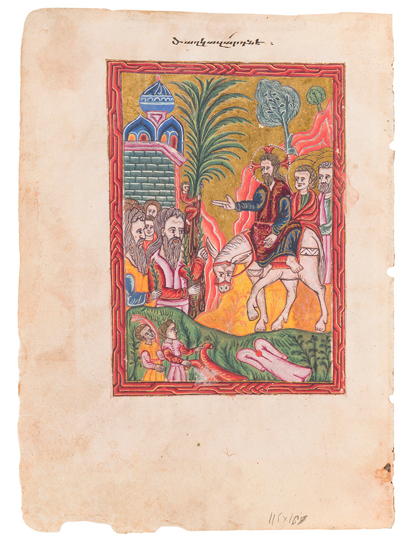 Estimation : 5.000-7.000 €. Feuillet extrait d'un manuscrit des Évangiles (Gospel Book). Entrée de Jésus à Jérusalem. Inscription en arménien (en caractères minuscules "bolorgir") au-dessus de la miniature. Constantinople, fin du XVIe siècle. Attribué au copiste et enlumineur Martiros de Khizan (vers 1546-1607). (125×88 mm) ©Ader