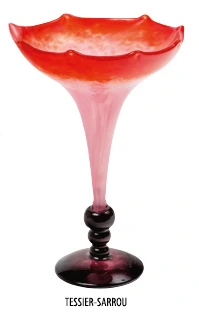 Coupe sur piédouche en verre marmoréen à nuances rose et orange, signée Schneider. (24 cm).