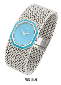Montre-bracelet de dame, de 1971, en or blanc et turquoise de la maison Piaget. Mouvement mécanique. Sept exemplaires ont été produits. (90 g).