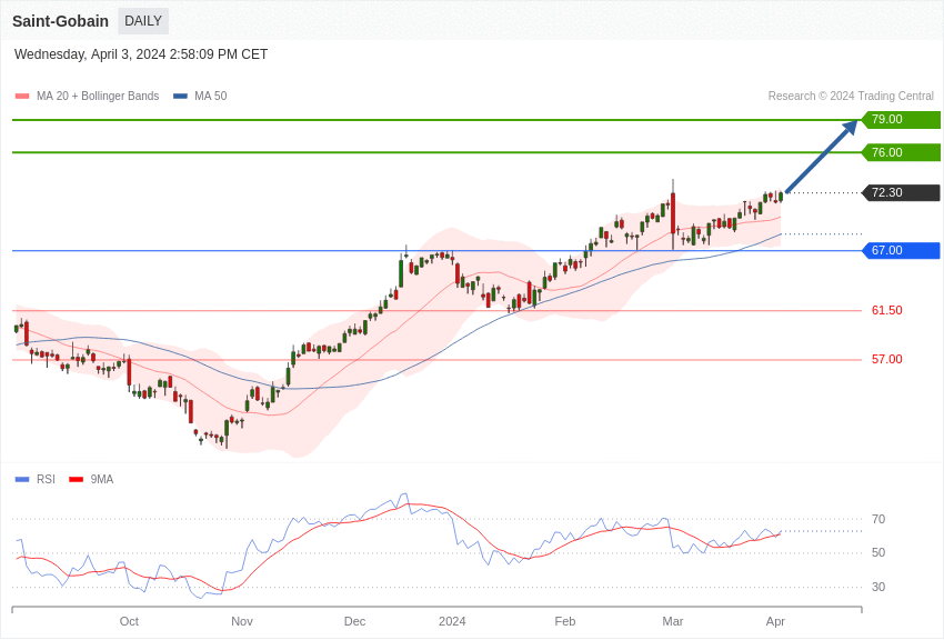 L’action Saint-Gobain affiche une configuration positive tant qu’elle évolue au-dessus du support de 67 euros.
