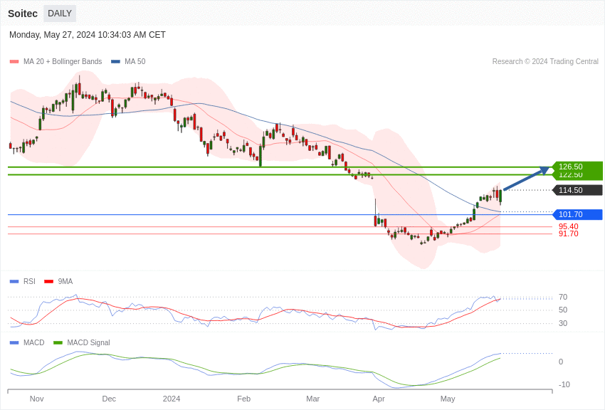L’analyse graphique de l’action Soitec se révèle positive, avec un support à 101,70 euros.
