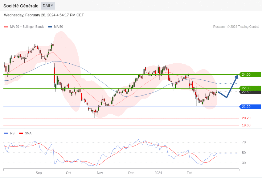 Si l’action de la Société Générale se maintient au-dessus de 21,20, elle pourrait atteindre une première résistance à 22,80 euros, puis une seconde à 24 euros.