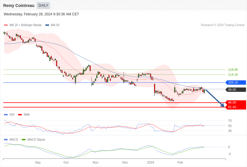 L’action du groupe français de spiritueux affiche une configuration négative tant qu’elle demeure sous 106,1 euros.