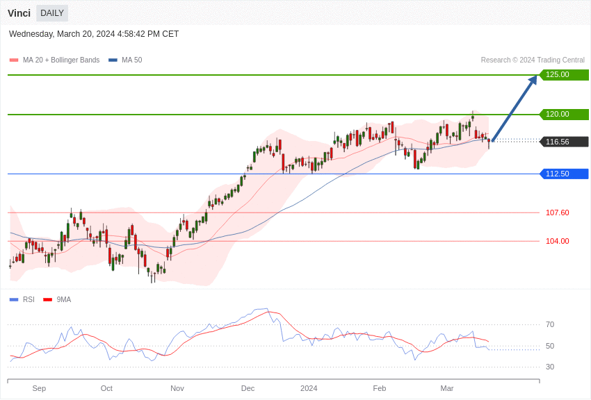Si le titre se maintient au-dessus de 112,50 euros, il pourrait atteindre dans un premier temps une résistance à 120 euros. Puis une seconde résistance à 125 euros.