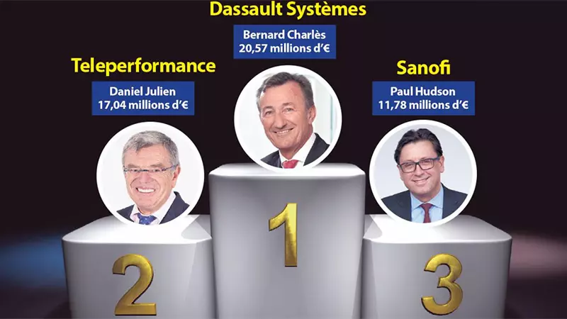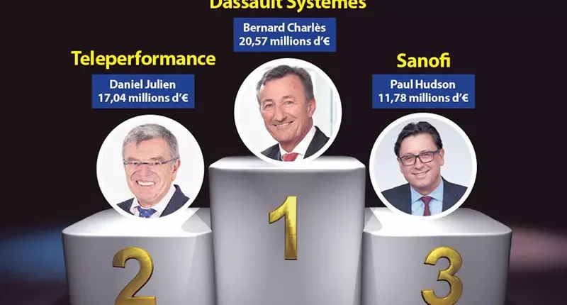 La première place revient pour la troisième fois consécutive à Bernard Charlès (Dassault Systèmes) avec 20,57 millions d’euros, suivi de Daniel Julien (Teleperformance) et de Paul Hudson (Sanofi), avec respectivement 17,04 millions et 11,78 millions d’euros.