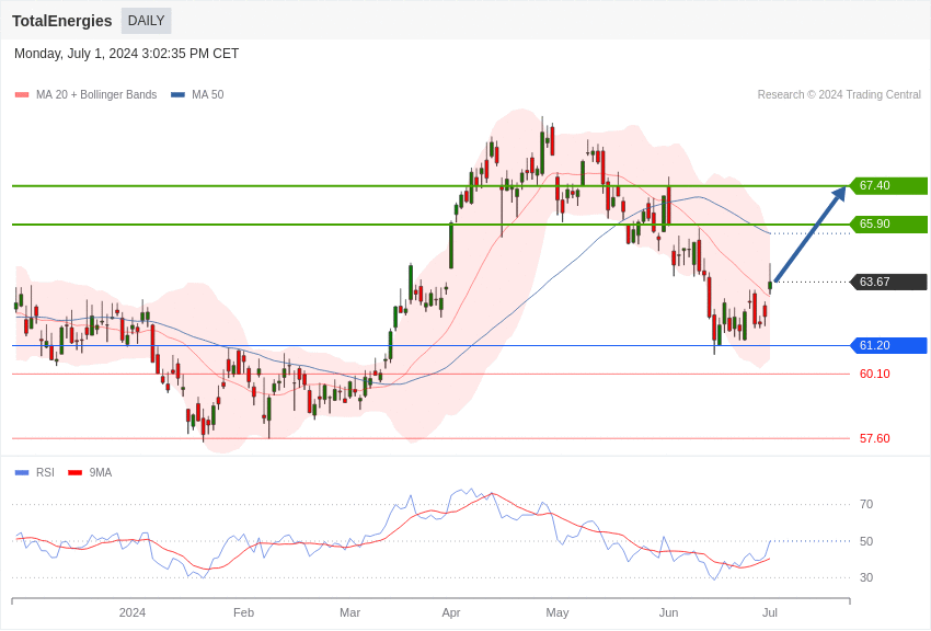 Le titre TotalEnergies affiche une tendance haussière tant que son cours se maintient au-dessus du point pivot de 61,20 euros.